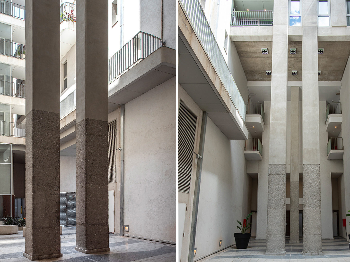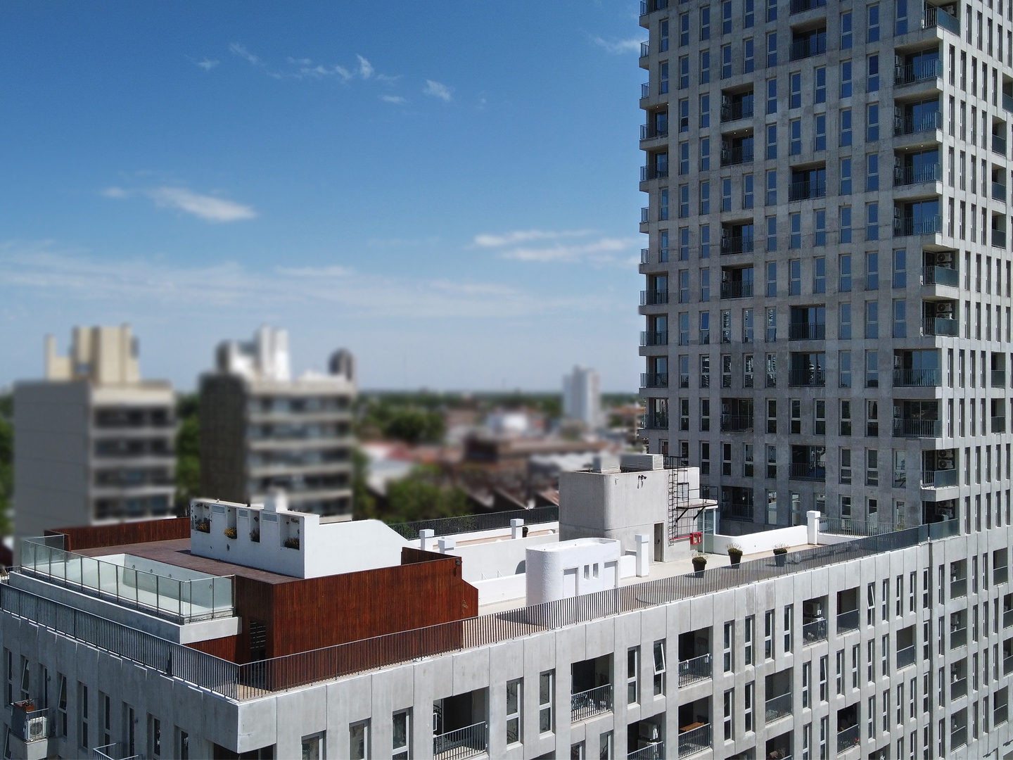 Edificio de vivienda multifamiliar de alta densidad con uso comercial a la calle y jardines internos en planta baja Dos subsuelos para cocheras con amenities y terrazas privadas en unidades superiores